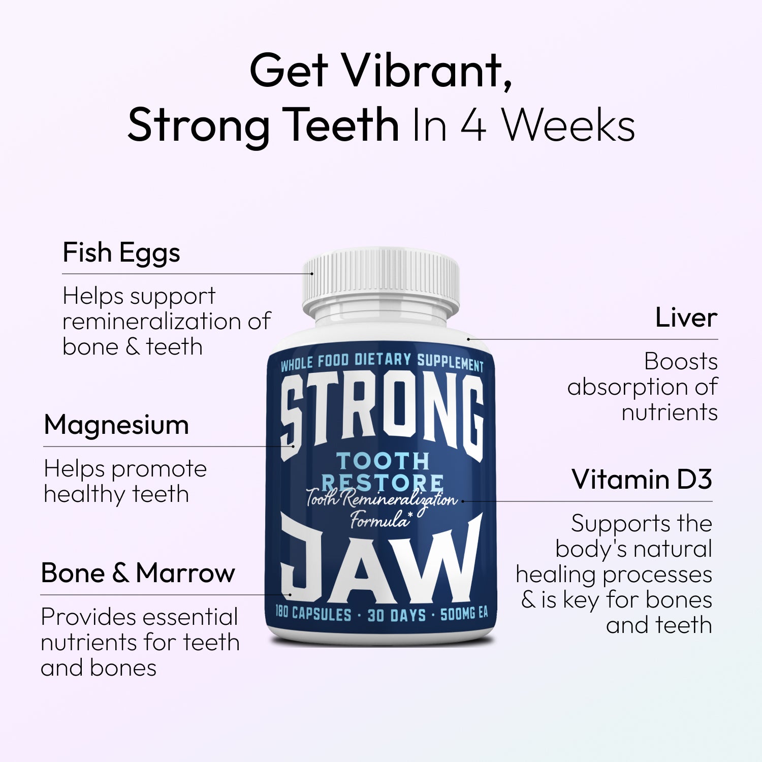 Tooth Restore is the dental health marvel we've all been waiting for. It combines powerful ancient nutrients to target tooth health at the root level. It boasts Fish Eggs for enamel remineralization, Liver for nutrient absorption, and Bone and Marrow for bone & jaw integrity. Once tried, it becomes an indispensable ally in your oral care routine.