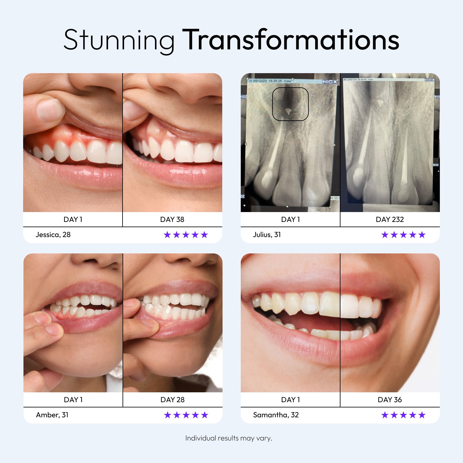 Based on an independent consumer perception study of 50 people after 30 days using Tooth Restore. Results may vary.